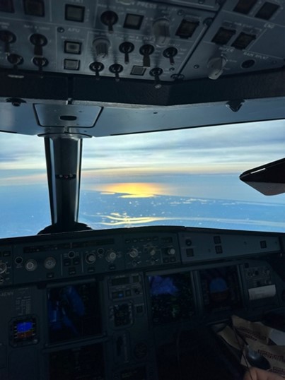 One flight impressed me thanks to a copilot who’s into constellations; she showed me on her app where the Big Dipper was ahead of us. And I hardly need to mention sunsets, which always cast the most beautiful light on the cloud layer – my daily highlight, especially on gloomy days on the ground. Today, I take a cockpit photo over France – just before Bordeaux, the Dune du Pilat comes into view. Stunning from up here!
